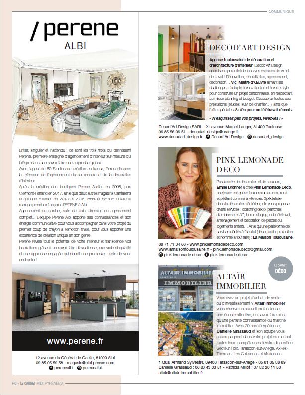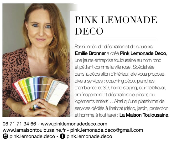 Ainsi, un dossier spécial Midi-Pyrénées est paru au sein du magazine le 3 septembre 2021. Ce numéro exceptionnel est l’occasion de valoriser le dynamisme des entreprises locales et/ou régionales auprès des lectrices du magazine ELLE de la région Midi-Pyrénées. L’agence Pink Lemonade Déco a été sélectionnée pour intégrer le carnet régional, rubrique Déco et Habitat et a fait l’objet d’un article représentant 1/6ème de page.